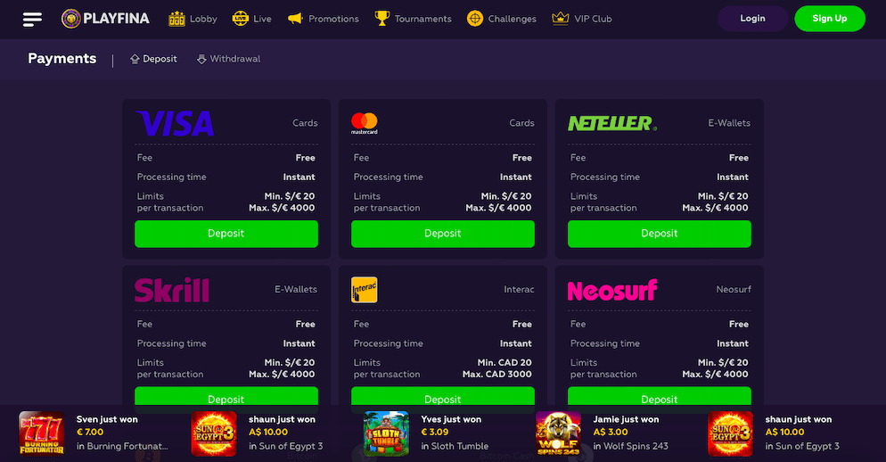 Playfina provides various payment options for users to deposit and withdraw funds. These options may include credit/debit cards, e-wallets, or bank transfers. It is essential to check the specific payment methods available in your jurisdiction before using Playfina.